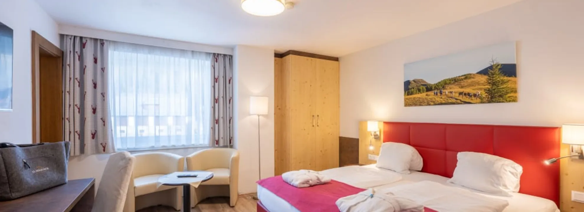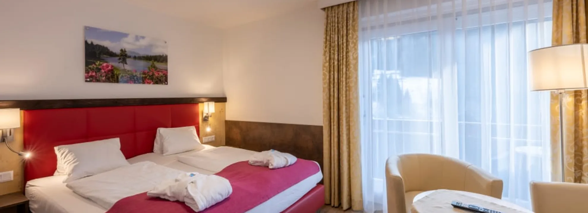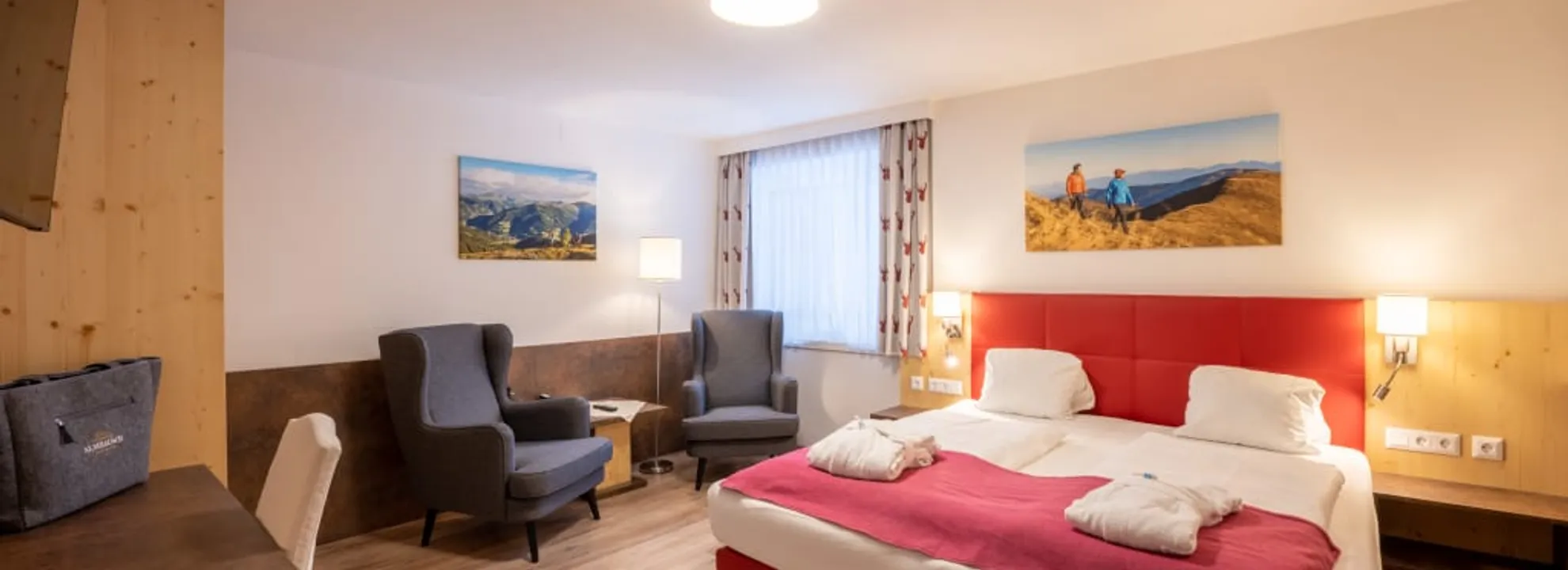 Entspannen Sie in Ihrem gemütlichen Zimmer, das entweder einen beruhigenden Blick auf die Berglandschaft oder die Ruhe eines Zimmers ohne Balkon bietet. Eine kuschelige Wellness-Tasche mit Bademantel und Handtüchern erwartet Sie bereits – perfekt für entspannende Stunden in unserer Wellness-Oase.