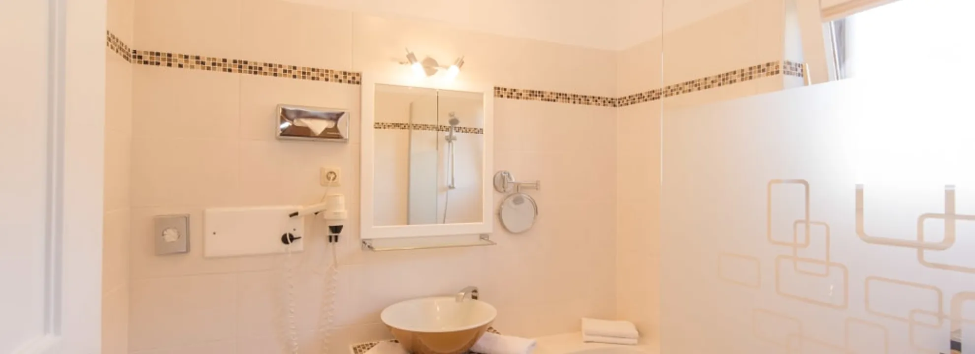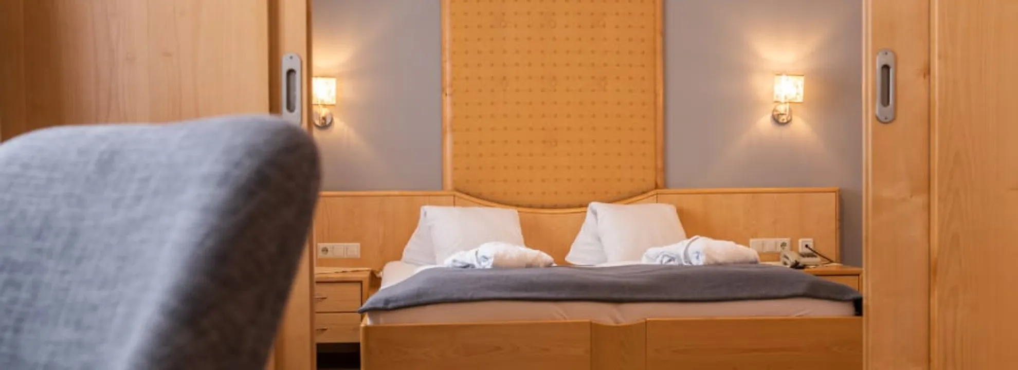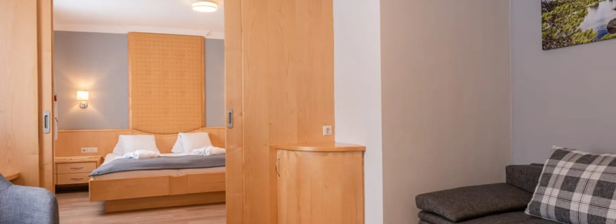 Genießen Sie erholsame Stunden in unserem komfortablen Familienzimmer. Der Schlafbereich der Eltern ist durch eine praktische Schiebetür vom separaten Schlafbereich der Kinder getrennt – ideal für Familien, die Privatsphäre schätzen. Eine Wellness-Tasche mit kuscheligem Bademantel und weichen Handtüchern erwartet Sie bereits auf Ihrem Zimmer, perfekt für entspannte Momente in unserer Wellness-Oase.